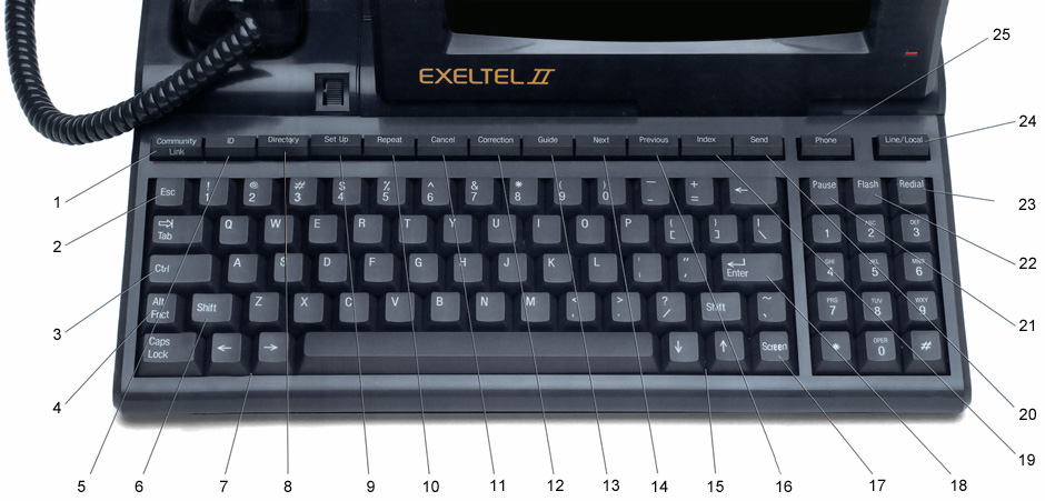 1: Connexion automatique au numéro de téléphone de CommunityLink d'US WEST. 2: Efface le dernier changement et/ou revient à la page précédente. 3: Touche de contrôle. 4: Touche ALT. 5: Transmet automatiquement l'identifiant et le mot de passe de l'utilisateur. 6: Touche Majuscule. 7: Touches de direction du curseur. 8: Affiche le répertoire téléphonique ou enregistre automatiquement un numéro de téléphone. 9: Touche de paramétrage d'Exeltel II. 10: Rafraichi la page. 11: Efface une ligne ou un champ de texte. 12: Efface le dernier caractère saisi. 13: Affiche l'écran d'aide. 14: Déplace le curseur à la ligne suivante ou envoi à la page suite. 15: Touches de direction du curseur. 16: Déplace le curseur à la ligne précédente ou renvoi à la page précédente. 17: Combiné à la touche majuscule imprime le contenu de l'écran. touche seule appuyée, active ou désactive l'écran. 18: Touche Entrée ou touche Envoi pour certains services. 19: Affiche le menu. 20: Valide une action en envoyant les données saisies. 21: Insère une pause de deux secondes lors de la composition d'un numéro. 22: Raccroche. 23: Recompose le dernier numéro de téléphone saisi. 24: Connexion/Déconnexion. 25: Donne la tonalité ou raccroche un appel vocal.