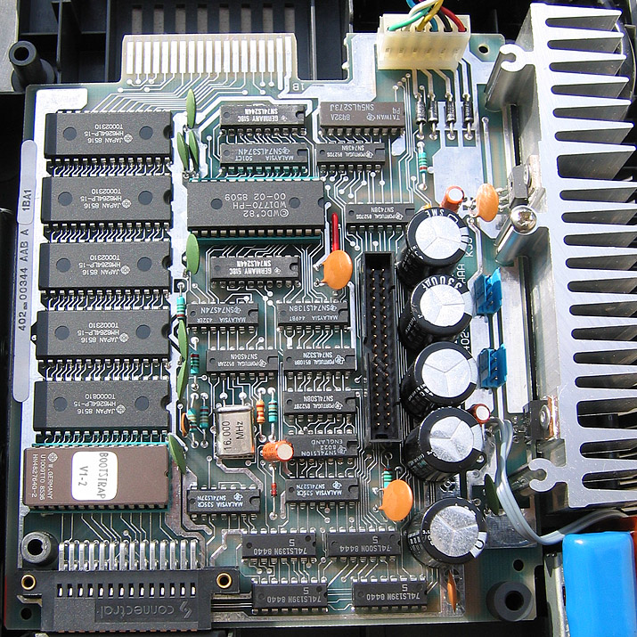 La fiche du contrôleur composée de 38 broches se connecte au slot CRAM situé à l'arrière l'ordinateur par l'intermédiaire d'un « Prolongateur ». Deux connecteurs (ici de couleur bleu) alimentent électriquement des lecteurs de disquettes.
